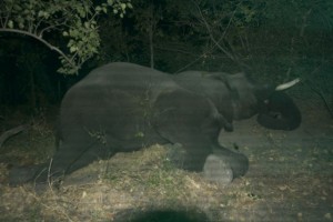 I went over to the window of my tent and pushed a flashlight up against the gauze and switched it on. The elephant bull was lying down, fast asleep on his side. At first I did not want to take his picture for fear of giving him a fright and waking him up. However after being kept awake for over an hour, I decided that he was in a deep enough sleep to try, so I did, and the results were great!