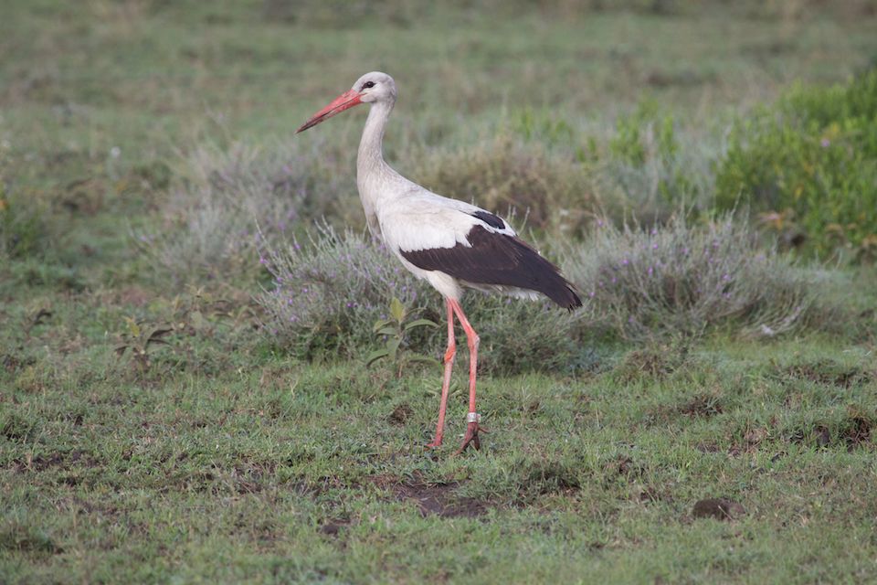 We drove past thousands of White Storks, but we noticed one with a metal ring on its foot. I couldn’t read anything on the ring through my binoculars, as the stork was moving, picking juicy caterpillars and crunchy grasshoppers that skipped away from the brushing hooves of the gnus, so I took a photo.
